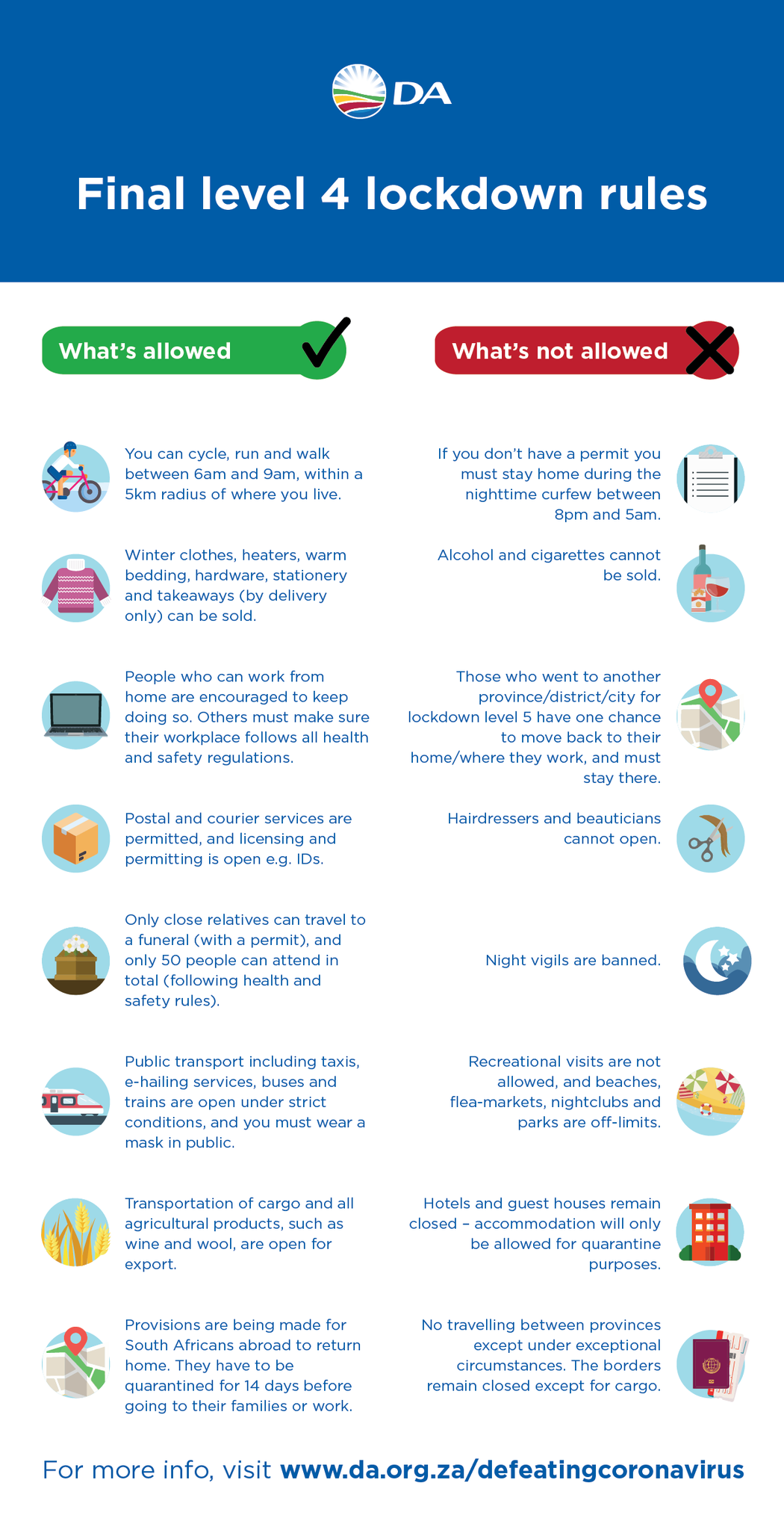 In his address to the nation, president cyril ramaphosa says government's focus is. Read all the latest news, breaking news and coronavirus news here What you can and can't do during level 4 of the lockdown several restrictions would remain in place regardless of the level of alert for as long as the risk of transmission is present. New level 4 lockdown rules — what you can and can't do. Check what the rules are in your part of the uk by entering your postcode or council name below.